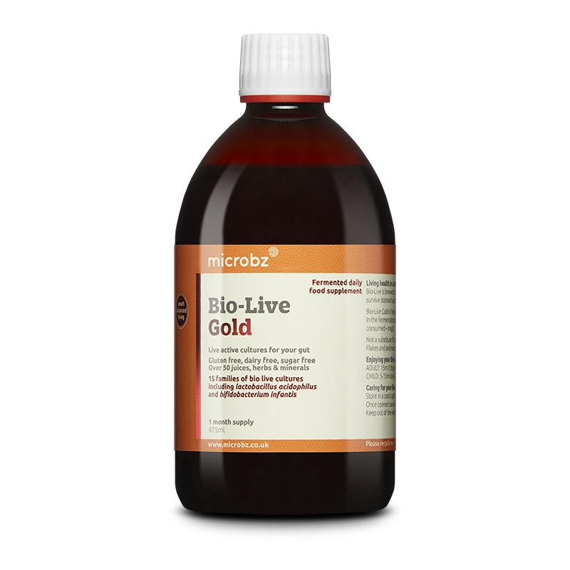 Liquide vivant fermenté avec 15 familles de cultures actives Bio-Live, plantes, jus et minéraux. Utilisable par les végétaliens et les végétariens
